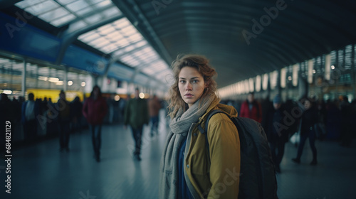 young woman with backpack in crowded train station, contemplating her journey amid bustling environment, neutral expression. fictional location