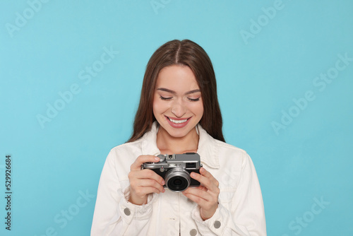 Young woman with camera on light blue background. Interesting hobby