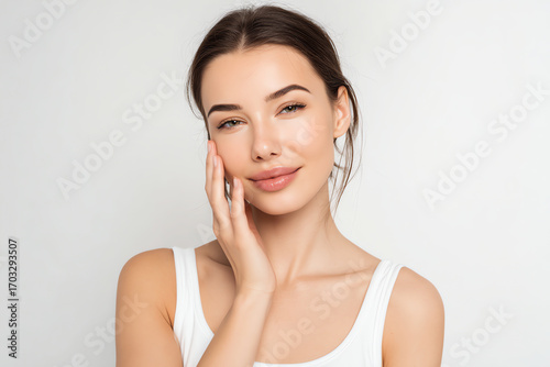Young woman with clear skin gently touching her face, smiling softly against a plain white background, wearing a white tank top and natural makeup