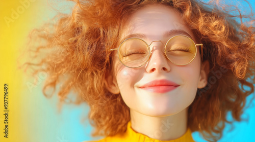 young, woman, curly hair, goggles, smiling, closed, eye, happiness, sunny, day, blue background, yellow background, joy, summer, carefree, outdoors, bright light, portrait, youth, beauty, fun, lifestyle, relaxation, warmth, positive, natural light, delight, enjoy, fashion, facial expression