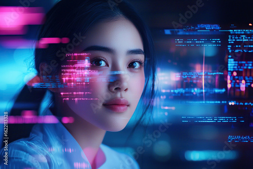 Young woman with dark hair, focused expression, surrounded by digital data and technology, representing innovation and virtual assistance