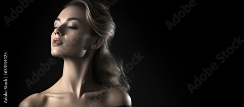 Young woman with glamorous makeup looking back over her bare shoulder black background with space for text in black and white