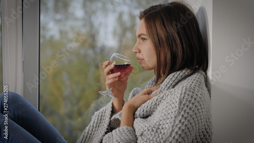 woman, glasses, drink, coverlet, window, lady, wine, sill, sitting, attractive, young, holding, autumn, cosy, warm, beverage, beautiful, leisure, passionate, clothes, rest, relax, lovely, weather, town, charming, home, house, indoor, horizontal, looking away, half face