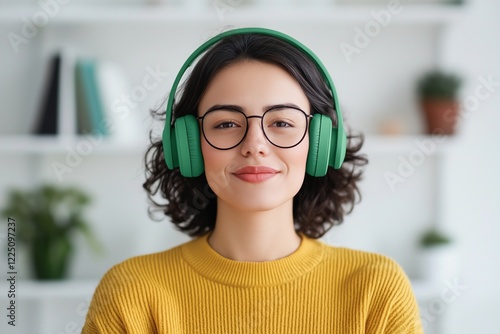 Young woman with green headphones enjoy music in a cozy indoor space while wearing a yellow sweater and smiling at the camera