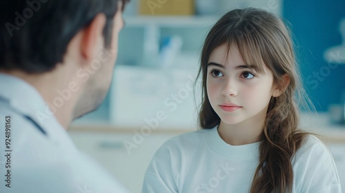 woman, portrait, listening, attentive, conversation, indoor, office, professional, business, meeting, interview, communication, young, brunette, sweater, white, blue, wall, background, facial, expression, serious, focused, eye, contact, interaction, dialogue, discussion, consultation, workplace, career, job, employment, corporate, casual attire, modern, interior, design, lighting, natural, daylight, atmosphere, mood, candid, authentic