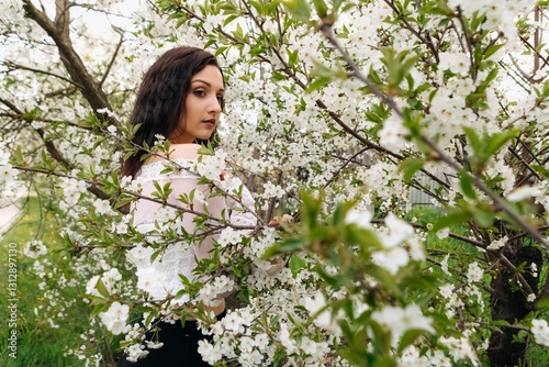 Young woman with long brown hair, wearing a white top, stands amidst a blooming cherry tree, gently touching the delicate white flowers and enjoying the beauty of the spring season