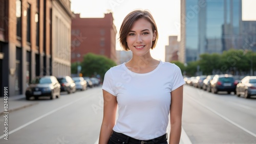 Young woman with short hair wearing white t-shirt and black jeans standing on cityscape background
