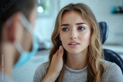 Young woman with toothache talks to her dentist during appointment at dental clinic, Generative AI