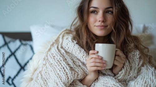 Young woman wrapped in a cozy blanket enjoys a warm drink while relaxing at home on a calm morning