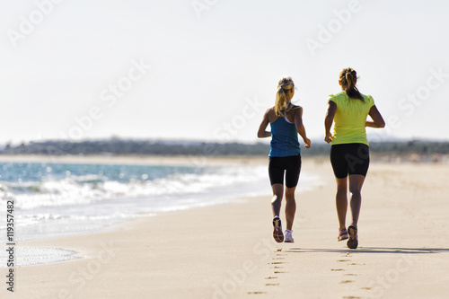 woman, exercising, runner, people, running, colours, leisure, outdoors, horizontal, two people, backview, jogging, copy space, beach, movement, footprint, adult, summer, sea, water, sand, day, health, direction, speed, muscle, activewear