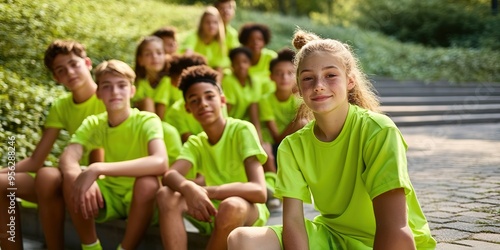 group, youth, vibrant, green, shirt, outdoors, oneness, team, togetherness, friendship, diversity, children, teenage, casual attire, sunny, nature, park, day, lifestyle, harmony, smiling, summer, fashion, lime, edgy, rebellious, style, bold, messy, unique, nonconformist, confident, expressive, copy space