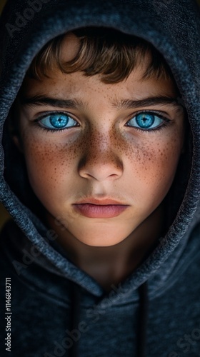 Youth with striking blue eyes and freckles wearing a dark hooded sweatshirt reflects determination and strength