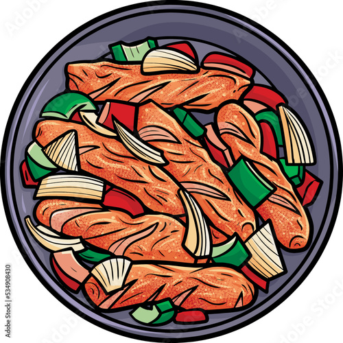 Yummy sausage with bell pepper in cartoon style