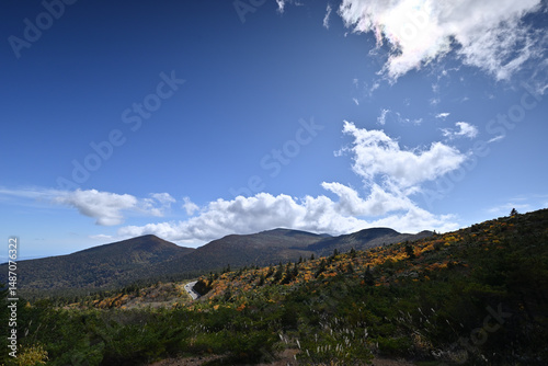 zao, mountain, duck pond, forest, japan, trekking, line, yellow, down, sun, space, climb, cloud, red, running, trek, cap, white, road, grass, street, wood, copy, up, ridge, sunny, climbing, sky, green, nature, tree, hiking, hike, leaf, slope, mount, hill, traverse, blue, winding, shiny, lake, walk