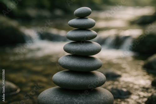 Zen Harmony: A serene stack of balanced stones stands as a testament to the power of equilibrium, mirroring the peaceful flow of a nearby stream, evoking tranquility and mindfulness.