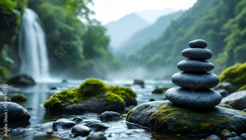 zen, stones, stacked, moss, rock, waterfall, gentle, mist, rising, mountain, range, lush, background, serene, tranquil, harmony, nature, balance, peaceful, meditative, scenic, outdoors, natural, calm,