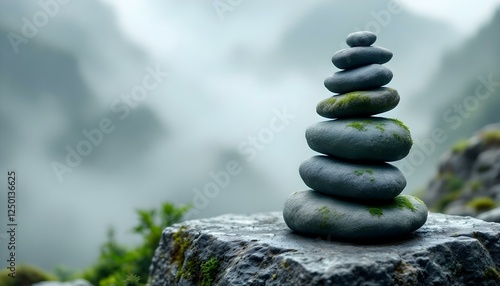 zen, stone, tall, stack, moss, rugged, surface, rocky, ledge, mountain, mist, thick, blurred, foggy, background, diffused, natural, light, photorealistic, detail, serene, tranquil, harmony, peaceful, meditative, nature, minimalist, alignment, mindfulness, textured, artistic, aesthetic, stillness, calm, perspective, atmospheric, mossy, scenic