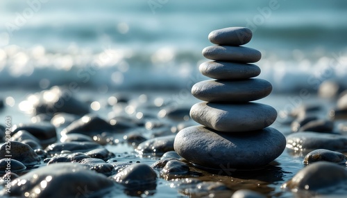zen, stones, tall, stack, smooth, rugged, textures, wet, rocky, surface, ocean, sea, spray, waves, dynamic, background, glistening, sunlight, gentle, photorealistic, quality, serene, tranquil, harmony