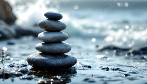 zen, stones, tall, stack, smooth, rugged, textures, wet, rocky, surface, ocean, sea, spray, waves, dynamic, background, glistening, sunlight, gentle, photorealistic, quality, serene, tranquil, harmony