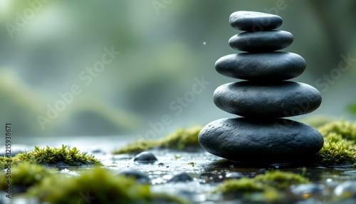 zen, stones, tall, stack, uneven, shapes, rugged, textures, mossy, damp, surface, morning, mist, soft, diffused, lighting, dewdrops, visible, natural, serene, tranquil, harmony, peaceful, meditative,