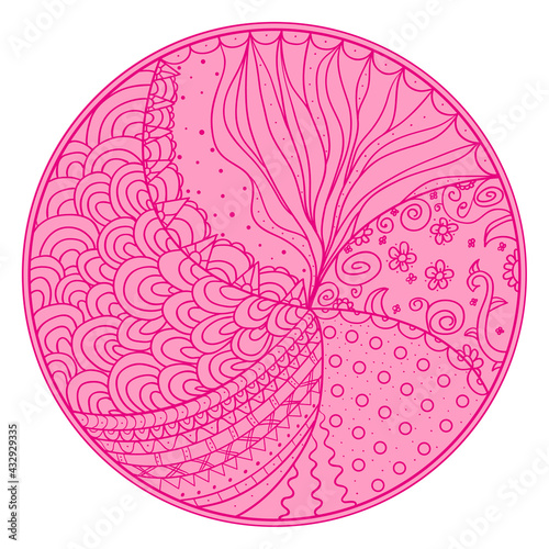 Zendala. Zentangle. Hand drawn circle mandala with abstract patterns on isolation background. Design for spiritual relaxation for adults. Line art. Print for polygraphy, posters, t-shirts and textiles