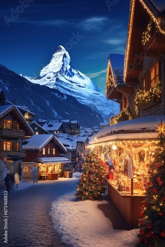 Zermatt, Switzerland. Abastract image of a Christmas Market, Matterhorn Mountain in Alps.