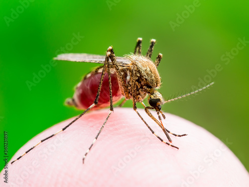 Zika Infected Mosquito Bite on Green Background. Leishmaniasis, Encephalitis, Yellow Fever, Dengue, Malaria Disease, Mayaro or Zika Virus Infectious Culex Mosquito Parasite Insect Macro.