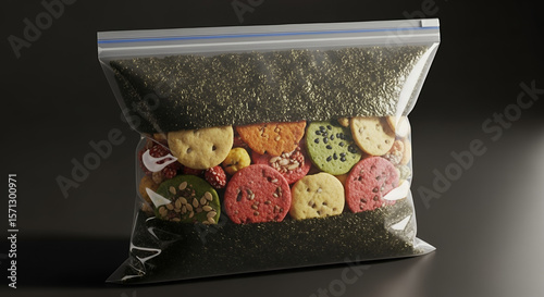 cookie, colourful, assorted, variety, snack, treat, dessert, baked goods, sweet, savoury, food, delicious, crunchy, round, plastic bag, cardboard box, storage, dark background, studio shot, nobody, horizontal, closeup, comfort food, indulgent, baked, texture, seed, nut, healthy snack, party food, mixed, diverse, creative, unique, epicure, culinary, food photography, selection, collection, convenience, box, fresh