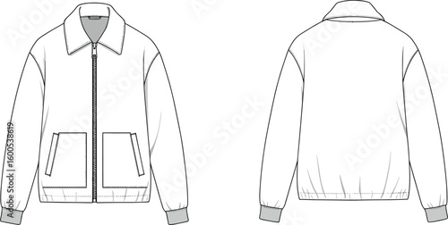 Zip-up jacket front and back view, fashion sketch, technical drawing, ribbed cuffs, collar design, front pockets, clothing template, apparel illustration