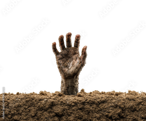 Zombie hand emerging from grave soil eerie scene horror concept isolated on transparent background, png