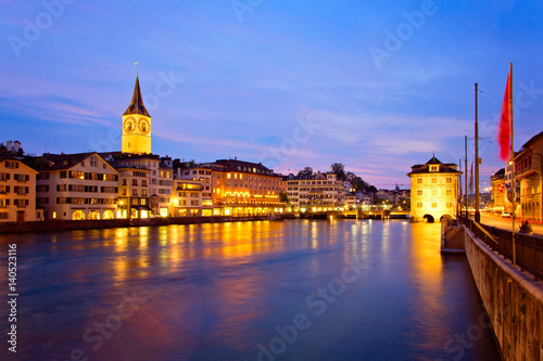 switzerland, zurich, alpen, landmark, tourist attraction, inner city, center, city, look, see, church, cathedral, limmat, flux, cupola, church steeple, minster, mountain, mount, recreation, travel, canton, europa, historic, evening, lighted, night photography
