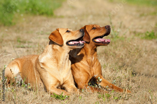 dog, labrador retriever, lie, 2, abreast, training, submissive, watchful, meadow, summer, pet, outside, horizontal format, sunshine