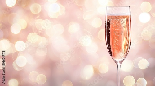 A glass of champagne rests atop a table with a pink-white bouquet of lights as the backdrop