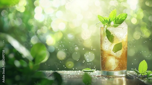 A glass of iced tea with a mint sprig on a table surrounded by green leaves