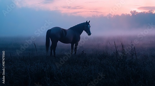 A horse stands in a field on a foggy day, with a pink sky in the background