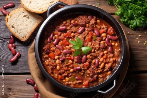 bean stew with ground beef, close-up in a bowl.