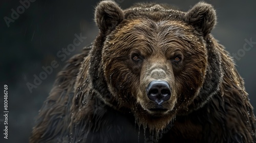 Close-up of a brown bear's face with water droplets on fur against a black backdrop
