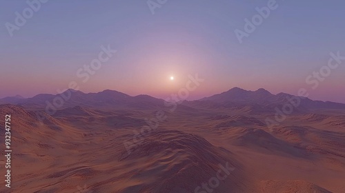 The sun descends behind mountains in a desert, casting a dramatic backdrop on a distant object