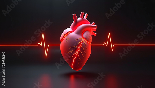 3D анатомическое сердце с ЭКГ на черном фоне.