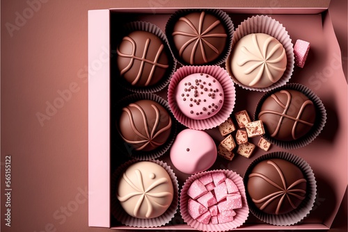 a box of chocolates with pink and white decorations on them and a pink bow on the top of the box, with a pink background. generative ai