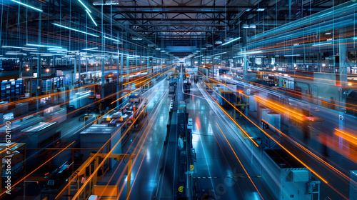 a bustling modern production facility, where the orchestrated dance of machines and workers is captured through the mesmerizing light trails they leave behind