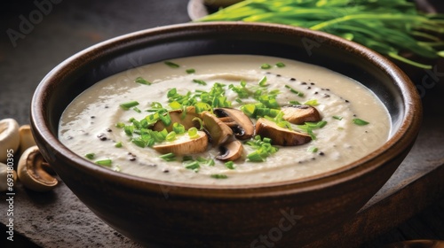 a close up of a bowl of soup with mushrooms and chives on a table next to a bunch of mushrooms and a bunch of green onions on the side.
