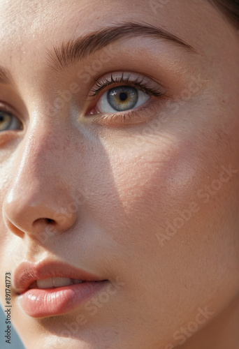 glowing, basking, sunlight, woman, beauty, face, make-up, model, fashion, skin, eye, lip, make-up, glamour, closeup, care, hair, up, constructed, cosmetic, red, studio, facial, clean, closeup, spa, skincare, person, beauty product
