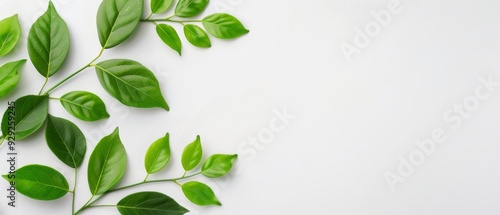 A collection of green leaves arranged neatly atop a pristine white backdrop, ready for superimposed text