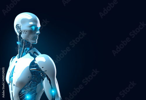 A humanoid robot looking back against a black background, There's no turning back. Artificial intelligence changes everything,copy space, Generative AI