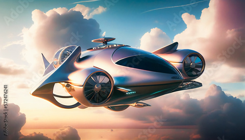 A model of a flying luxury car in the air above the clouds. Generative AI.