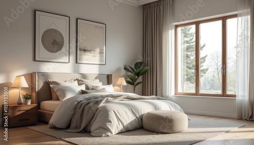 A serene bedroom features a large bed with white linens, a nightstand with a lamp, and a large window with a view of trees. Two framed artworks adorn the wall, and a plant sits on the windowsill.