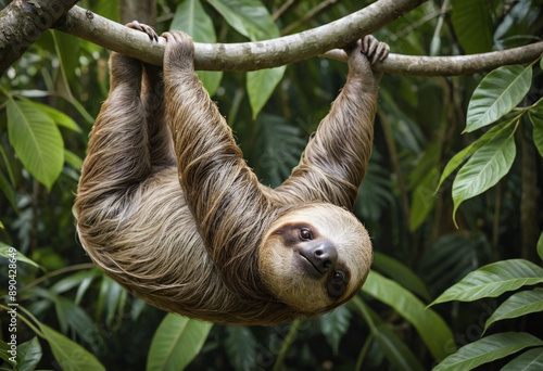 sloth, hanging, upside, down, from, rainforest, tree, camouflaged, among, leaf, landscape, animal, forest, wild, nature, mammal, wildlife, zoo, safari, family, animal, park, reptile, creature, conservation, vet, ecotourism