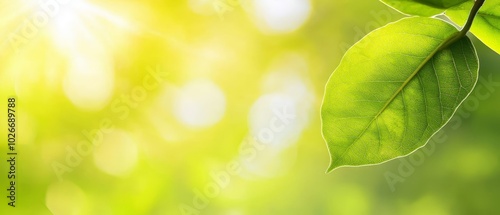 A tight shot of a green leaf on a branch, sunlit by beaming rays, backdrop softly blurred