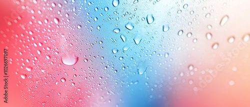 A tight shot of water droplets on a glass pane, backdrop blurred in red, blue, and pink hues